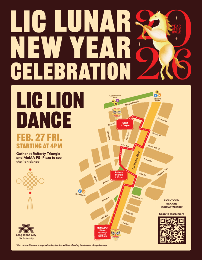 LIC Lunar New Year 2026 culminates in a Lion Dance procession along Jackson Avenue from LIC Food Hall to MoMA PS1 on Friday, February 27, at 4 p.m. The lion dance will kick off at the corner of 28th Street and 42nd Road at 4 p.m., stop briefly in Rafferty Triangle at 4:45 p.m., and conclude at MoMA PS1 Plaza around 5:20 p.m. for closing remarks from elected officials.